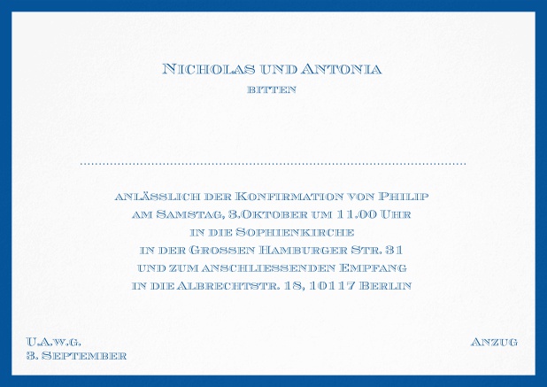 Klassische Einladungskarte mit elegantem dünnen Rand in der Farbe Ihrer Wahl. Passen Sie den Text an Ihr Event an, z.B. zur Konfirmation oder Kommunion und genießen Sie eine einfache Eventplanung.