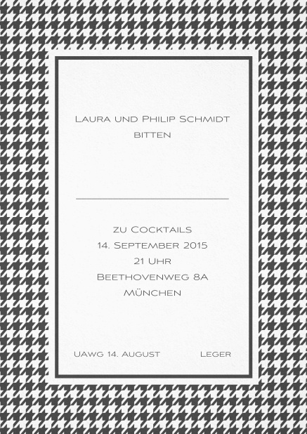 Passen Sie diese klassische Einladungskarte mit bayerischem Muster als Rahmen an Ihre Wünsche an. Fügen Sie die Namen Ihrer Empfänger hinzu, versenden Sie online oder auf Papier.