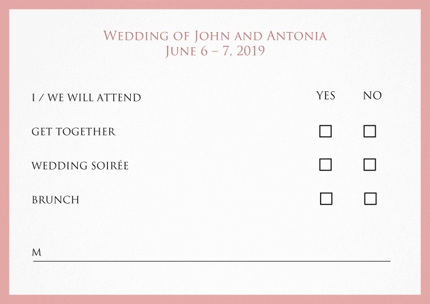 Matching paper reply card with post card back for design Bordeaux with multiple reply options and space for name. Customize text, boxes and return address as you wish.