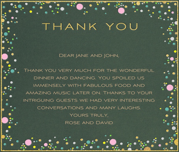 Sparkling Wish - green. Dark Green Thank You Card with Colorful Circles.