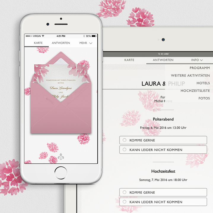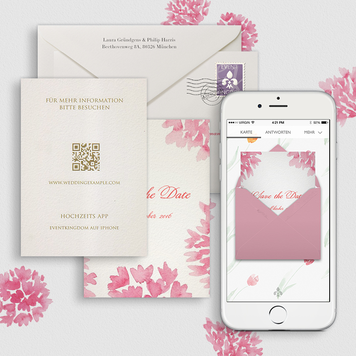 EventKingdom gives you the possibiity to order beautiful paper cards and link them via a domain to a wedding website like www.weddingexample.com. Your guests can easily RSVP on the wedding website and also find all needed information concerning hotels, programme, travel, registry and more.